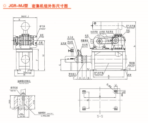 首先,一套完整的羅茨鼓風機包括:風機主機、共享底座、電機、電機坐桿、皮帶、皮帶輪、皮帶護罩、三通、泄壓閥、逆止閥、壓力表、入口消音器、出口消音器、防震接頭、防震腳墊、配套螺絲等組成。